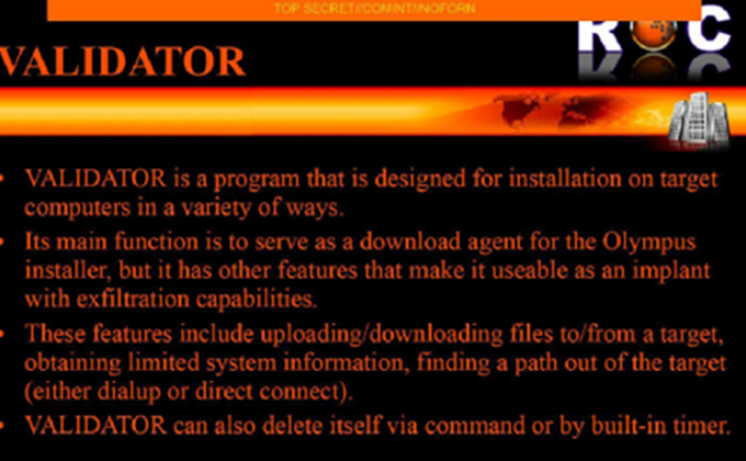 Among the Snowden leaks, one document page describes the Validator. Related documentation indicates this Trojan acts as a probe to verify the identity and location of other Trojans. Once confirmed, it delivers either OLYMPUS or UNITEDRAKE (i.e., the Equation Trojan EquationDrug).