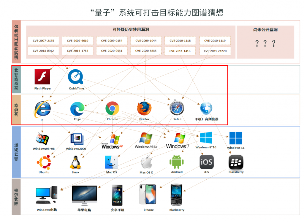 The deployment principle of “Quantum Penetration” is illustrated in Figure 2-1. Its targets are individuals accessing the internet. Conventional cybersecurity understanding treats open ports and services as fixed exposure points—vulnerabilities or flaws can be exploited for attacks. However, the internet access process involves browsers or mobile apps establishing connections to fixed ports on target hosts using randomly assigned high-level ports, which are often considered secure. This is precisely where the U.S. approach targets. By compromising vast numbers of network-connected devices—such as switches and routers—operated by global operators, the attackers establish the capability to intercept internet sessions. They then analyze and extract metadata from these sessions, submitting it to corresponding systems for matching. Temporary traffic is inserted into these internet connections to achieve attack objectives. This temporary traffic can trigger browser overflows, redirect downloads to trojans, and more. Since the attack traffic is inserted temporarily into the communication process via compromised network devices, its actions are difficult to reproduce or trace back in the TCP/IP sense. Browser vulnerabilities form a key focus of U.S. cyberattack reserves. As browsers are essential tools for internet access, and with mobile terminals now dominating online activity, many so-called apps are essentially browser shells. Exploiting browser entry points offers formidable attack capabilities, including browser plugins like the highly vulnerable Flash and QuickTime plugins. Given the U.S.’s reserve capacity, it’s plausible that severe historical vulnerabilities in these browsers were exploited by the U.S. before public disclosure.