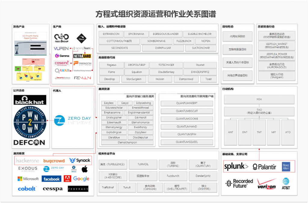 The U.S. intelligence agencies globally collect and procure zero-day vulnerabilities through public security activities, agent models, vulnerability bounty collaborations, and procurement from cyber arms dealers. By establishing cyber programs, weapons, infrastructure, and big data support with cyber defense contractors, telecommunications infrastructure companies, and internet firms, they leverage globally deployed project and operation platforms. Utilizing implant, carrier, and relay equipment, they deploy various advanced malicious codes through vulnerabilities. launching extensive attack operations against global IT targets. The organizational operations and operation relationship diagram is shown in Figure 4-5.