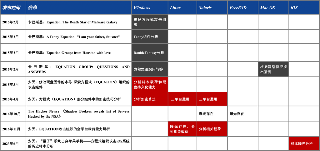 Simultaneously, Kaspersky and Antiy completed the relay of multi-platform sample coverage for the Equation Group (i.e., NSA TAO). The process of first exposing samples across platforms within the Equation attack ecosystem is shown in Table 1-2: Windows and macOS samples were first disclosed by Kaspersky, while Kaspersky proposed the existence of FreeBSD samples (unpublished samples). Linux and Solaris samples were first disclosed by Antiy. iOS attack activities were first exposed by Kaspersky, but the first sample report was published by Antiy.