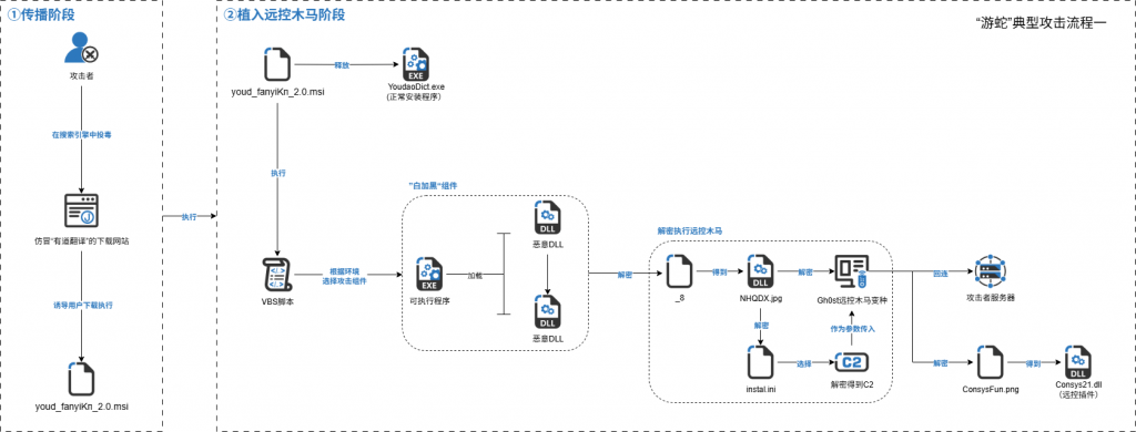 After the first type of sample is run, the normal “NetEase translation installation software” is released, and the VBS script is executed covertly. The VBS script queries whether there are 360 * * * .exe, QQ * * * .exe and Hips * * * .exe processes by executing WMI, and selects different attack components according to the results. Although these attack components are different, they all use the same decryption means to decrypt the “_ 8” file to get the NHQDX. jpg file. The file decrypts the data at the specified offset to obtain the Gh0st remote control Trojan variant, and selects the corresponding 80 built-in C2 addresses according to the instal. ini configuration file to decrypt. Consysfun.png is a remote control plug-in that is encrypted and the attacker sends instructions to the remote control Trojan horse to call the specified function in the remote control Trojan horse plug-in “Consys21.dll.”