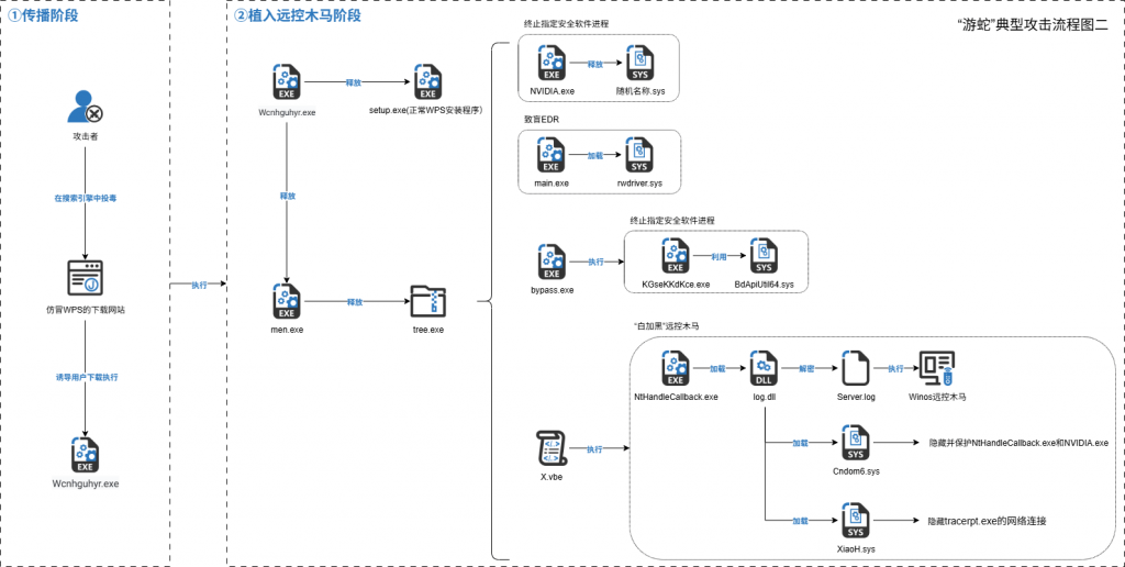 After the second type of sample is run, the WPS installation program and the malicious program which execute normally are released, and the malicious program releases a plurality of attack components in a specified path, Blind EDR, terminate the designated security software process, hide the process and network connection, and execute Winos remote control Trojan in the mode of “white plus black.” Winos is a remote control Trojan with high frequency in the past two years, which is modified by Gh0st remote control and supports the execution of various function modules in the form of plug-in.
