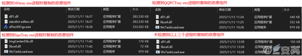 Inquire whether the target device has 360 security guard process (360 * * * .exe), QQ computer housekeeping process (QQ * * * .exe), and teflon security software process (Hips * * * .exe) through WMI; Execute different component files based on the above query results, and delete other subsequent useless files. Although these attack components differ, the core process for decrypting and executing remote control Trojans is the same.
