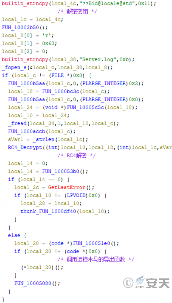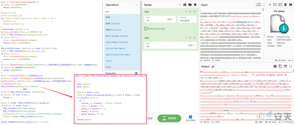 The remote control Trojan file contains a DLL file whose file header is modified, and after the file header is restored, the DLL file decrypts “ConsysFun. png” to obtain the remote control Trojan plug-in originally called “Consys21.dll.”