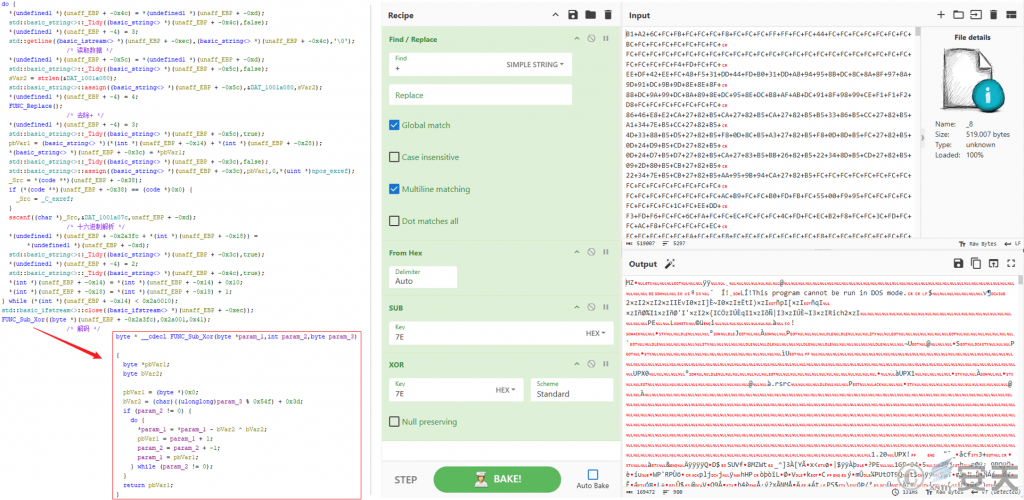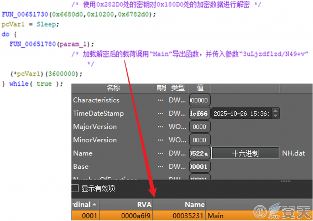 The malicious DLL files in the four groups of malicious components adopt the same decryption logic (only the code implementation details are slightly different, and the first group is taken as an example below): The first DLL file reads the specified file first, and the “+” character is removed. Then perform subtraction and exclusive-OR operation on the content with 0x7E as the key, and then call the second DLL and transfer the decrypted data to the second DLL, which will perform PE parsing on the received content and find the export function corresponding to the file formerly named NHQDX. jpg. The load is finally completed.
