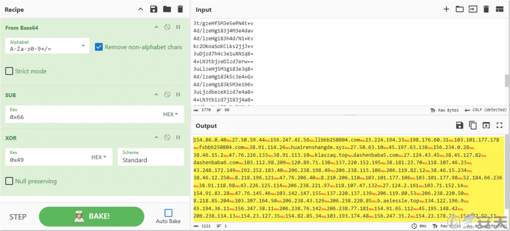 There are 80 encrypted C2 server address strings in the NHQDX. jpg file, which gets the value of its id by reading the instal. ini file, The id value (80 for this sample) is decoded and the corresponding C2 address therein is selected based on the value. The remote control Trojan receives the encrypted C2 address string when it is loaded, uses Base64 decoding to perform subtraction and exclusive OR operations, and restores the C2 address. The list of C2 addresses contained in NHQDX. jpg is shown below.