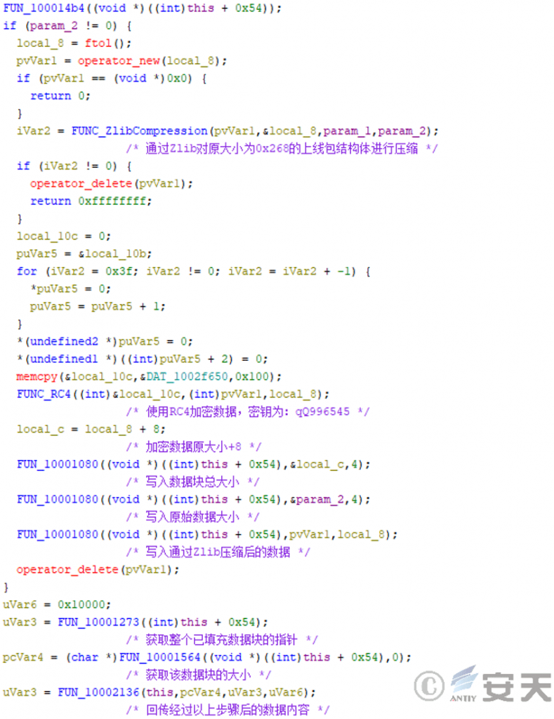 The remote control Trojan NH.dat collects information such as system version, host name, running time and date, and running status of specific process according to a user-defined structure; first, the information is compressed by Zlib. Then the key “qQ996545” is encrypted by RC4 algorithm, and the total size of the packet and the original size of the original data are added before the processed packet.