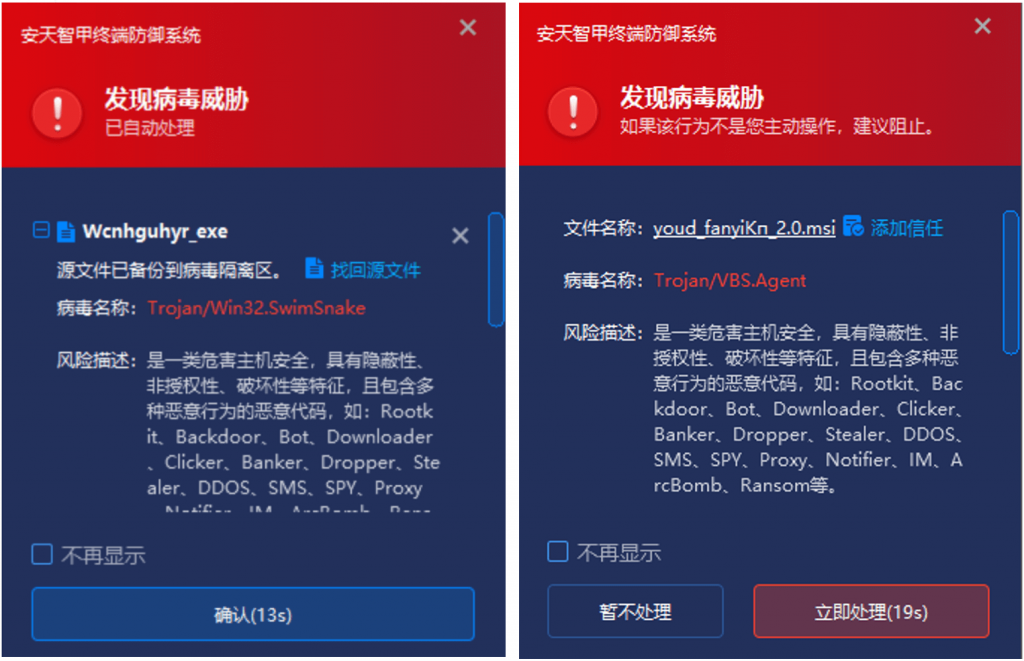 IEP is embedded into Antiy AVL SDK anti-virus engine to scan file objects, storage objects, sector objects, memory objects and registry data objects, and judge whether the detection objects are known or suspected viruses. In order to realize accurate judgment, investigation and killing. In particular, it can nest and scan that compressed package object, and scan the memory object based on the memory map, so that a variety of camouflage and kill-free methods can not be hidden. In case 1 and case 2, when the user stores the malicious files youd _ fanyiKП _ 2.0. msi and Wcnhguhyr.exe locally, an alarm will be generated immediately, and the malicious files will be cleared, without giving the chance to start the virus.