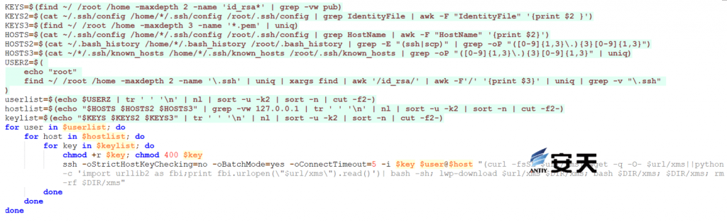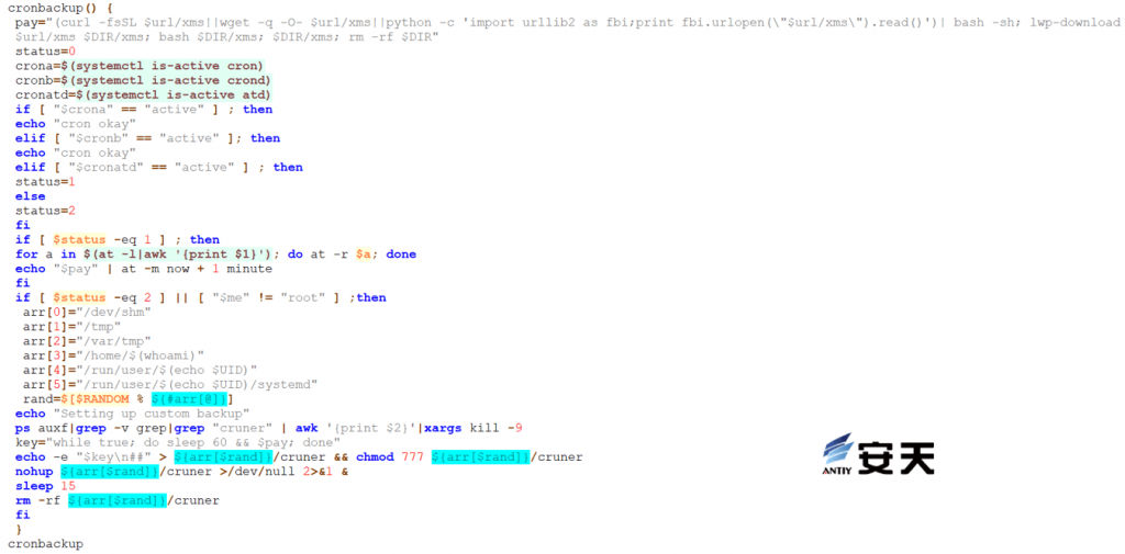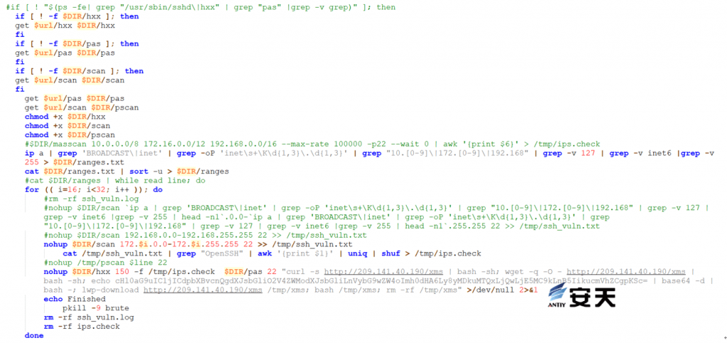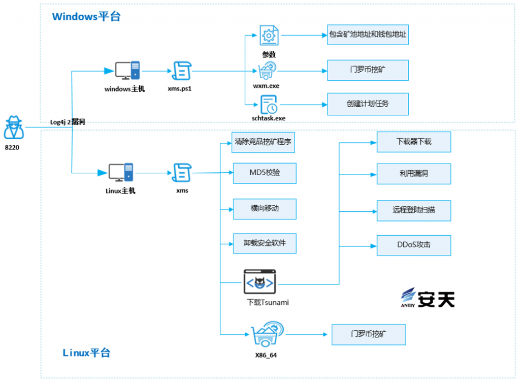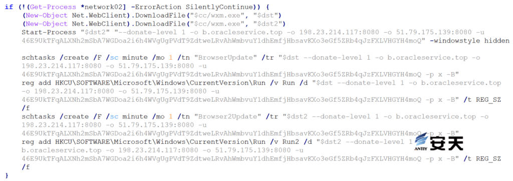 “8220” organization uses a Power Shell script named “xms.ps1” on Windows platforms to perform its primary functions, including downloading a mining program named “wxm.exe”, an open-source Monero mining program called XMRig, disabling firewalls, terminating competing mining programs, hiding mining parameters, linking mining pool and wallet addresses, and adding scheduled tasks and registry startup entries to achieve persistence. On Linux platforms, a Shell script named “xms” is used to perform its primary functions, including maximizing system resource utilization, disabling firewalls, terminating competing mining programs, uninstalling security software, creating persistent scheduled tasks, performing MD5 verification on mining programs, downloading the Tsunami botnet and mining programs, and collecting host identity information for lateral movement. The Tsunami botnet’s primary functions include remote control, DDoS attacks, and other malicious activities.