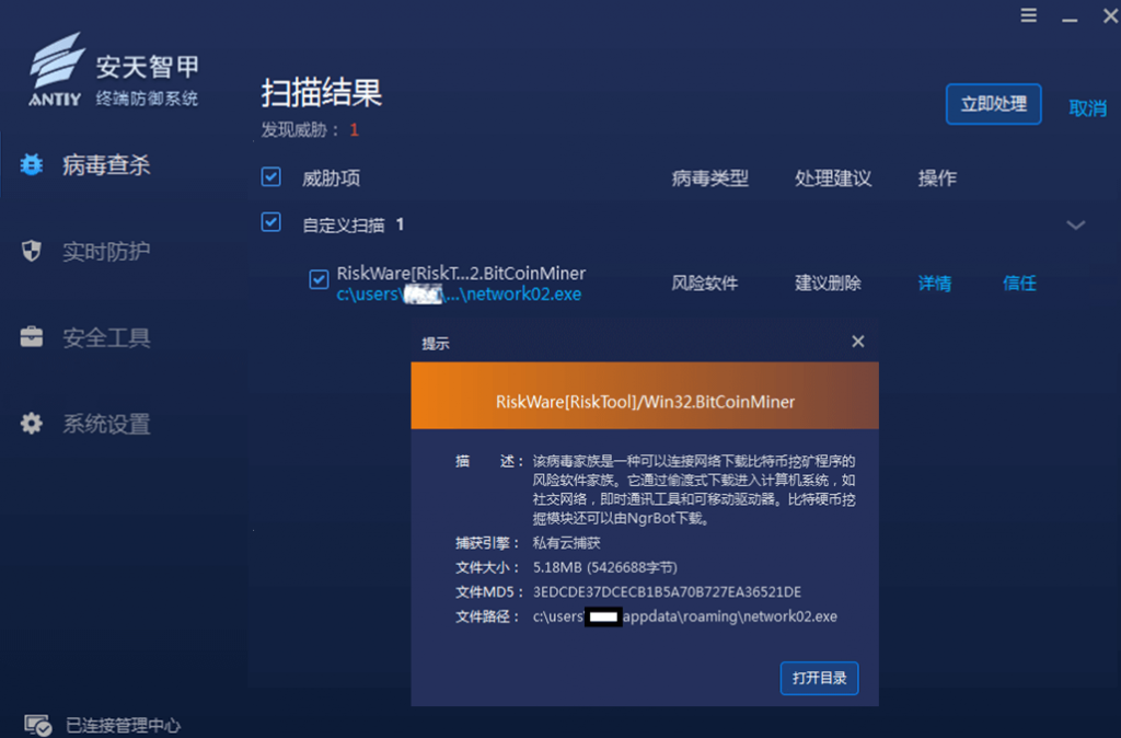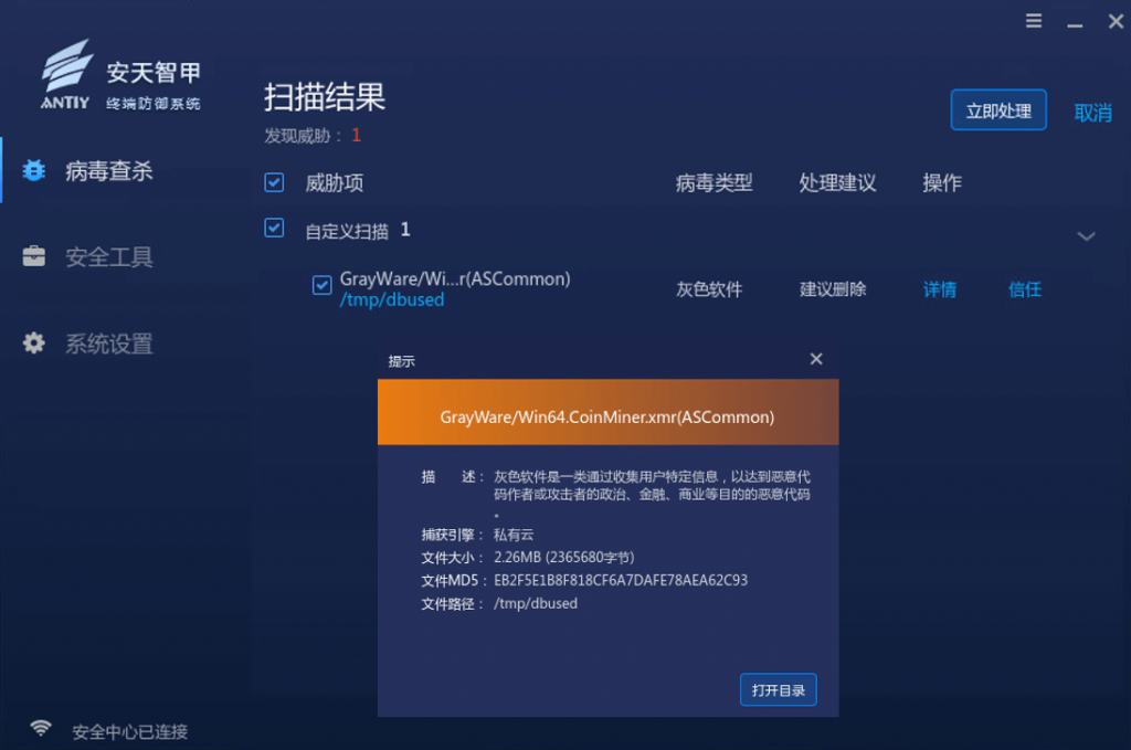 It has been verified that both the Windows and Linux versions of Antiy Intelligent Endpoint Protection System (IEP) can detect and effectively protect against mining Trojans and botnet programs.