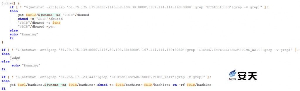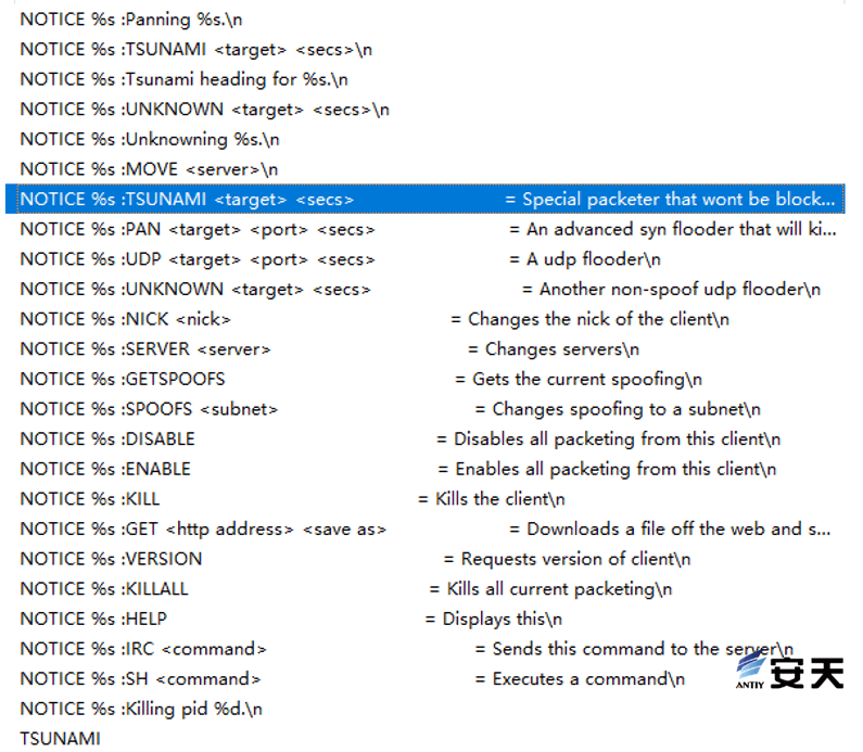 The Tsunami botnet operates based on the command and control server of Internet Relay Chat (IRC), and modifies the DNS server settings in the configuration of the infected device, so that the traffic from the IoT device is redirected to the malicious server controlled by the attacker. The Tsunami botnet mainly spreads by downloading with downloaders, exploiting vulnerabilities, remote login scanning, etc. The main functions of the Tsunami botnet program are remote control, DDoS attacks and other malicious behaviors. Antiy has previously analyzed the Tsunami botnet in detail in “Analysis of the precise deployment of the Tsunami botnet and the “Magic Shovel” mining trojan” ,[ 1] so we will not analyze it in detail here.