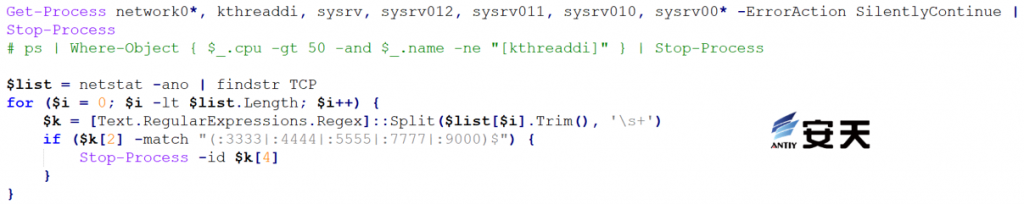 Terminate the competing mining program process, traverse the ports 3333, 4444, 5555, 7777, and 9000 connected to the process, and then terminate the processes connected to the above ports.