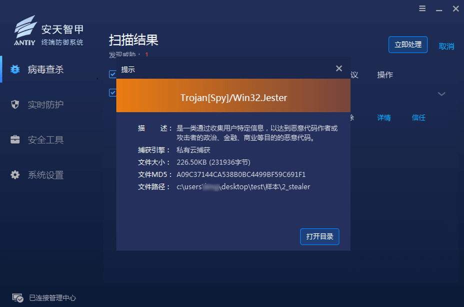 Antiy CERT consistently monitors the technical changes and characteristics of malicious code, such as stealing Trojans and clipboard hijackers, and proposes corresponding solutions, which are then deployed in security products. Antiy IEP not only provides basic functions such as virus detection and active defense, but also offers enhanced capabilities such as terminal control and network control, effectively defending against such threats and ensuring user data security.