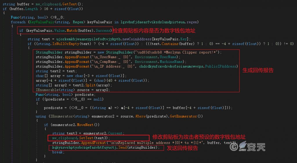After the Merlynn Clipper clipboard hijacker runs, it will continue to monitor the system clipboard. If the clipboard content is a digital wallet address, it will be replaced with the attacker’s preset wallet address to hijack the victim’s digital currency transfer and other operations, causing damage to the victim’s virtual property.