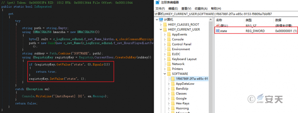 By setting and checking the registry “HKEY_CURRENT_USER\SOFTWARE\1f66786f-2f7a-e85c-9153-f9809a7bbf87\state”, the stealing program is prevented from being repeatedly executed on the same device.