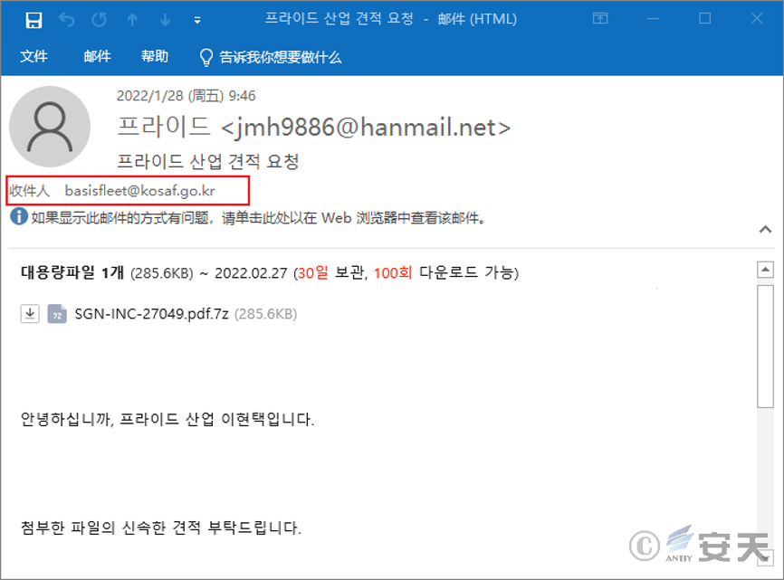 Antiy CERT has monitored a hacking campaign targeting a number of institutions, including the Korean Scholarship Foundation and Heavy Industries. The attacker uses the phishing mail to deliver the compressed package file named “SGN-INC-27049.pdf. 7z,” and the quotation with the theme of “request for quotation of basic industry,” so as to induce the victim to decompress and execute the LokiBot secret Trojan horse in the compressed package. Carrying out a covert operation.