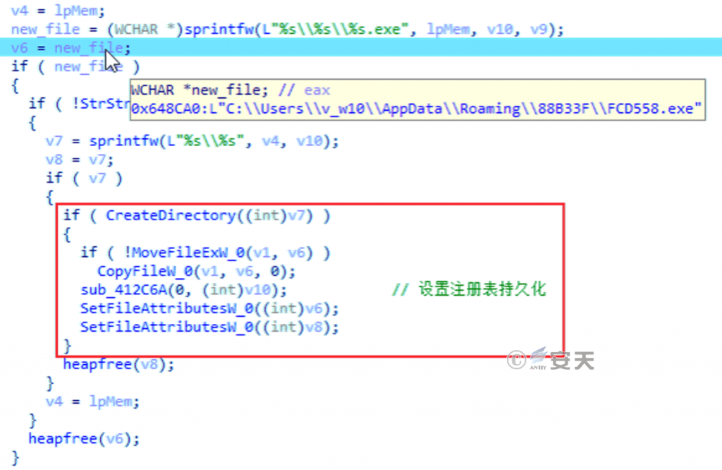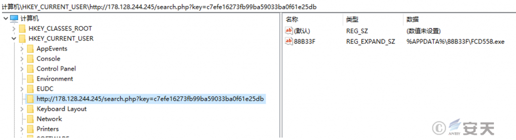 Use the SHRegSetPathW function to set a self-start key in the registry, but the actual registry path set by the sample is “HKEY_CURRENT_USER\<C2地址>,” which is not “HKEY_CURRENT_USER\Software\Microsoft\Windows\CurrentVersion\Run” A string modification error that appears to have occurred when an attacker set the C2 address.