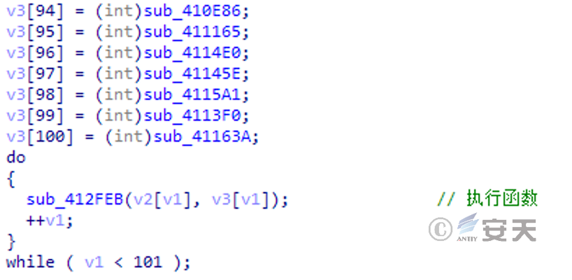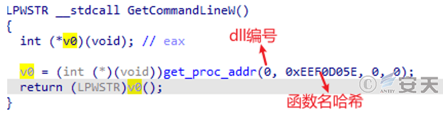 The sample obtains the desired API address by comparing the hash value of the API function name.