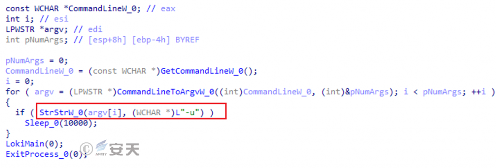After the sample is started, the -u parameter, which is used to upgrade the sample itself, is checked first, and execution is delayed for 10 seconds if any.