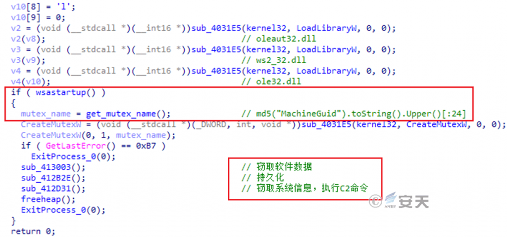 Use the WSAStartup function to initialize the network object and create the mutex. The first 24 characters of the MD5 hash value with the mutex name as the device identification number are capitalized, or a random 10-bit string if it cannot be obtained. After the mutex is successfully created, the overall operation flow is as follows.
