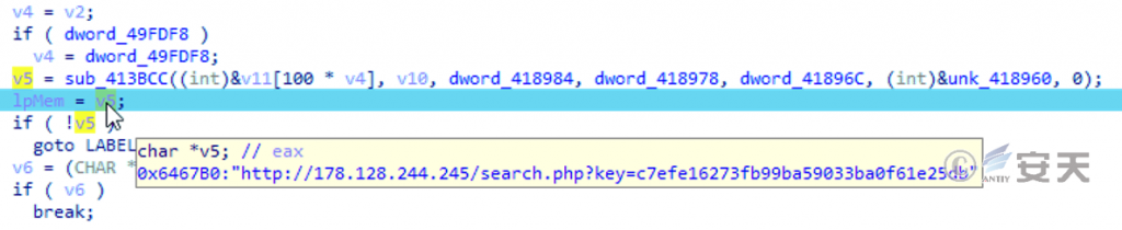 Decrypt C2 address “http://178.128.244.245/search.php?Key=c7efe16273fb99ba59033ba0f61e25db” in memory.