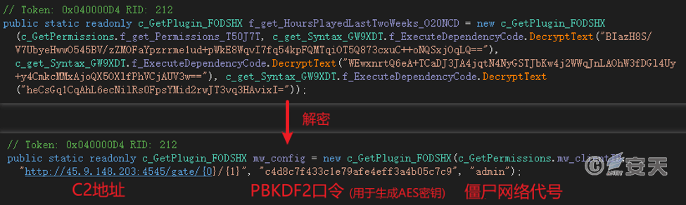 Connect http://45.9.148.203:4545/gate/<用户ID>/getFile?name=<僵尸网络代号>_plugin_settings.json to obtain the configuration information. the decrypted contents and meanings are shown in the figure below.