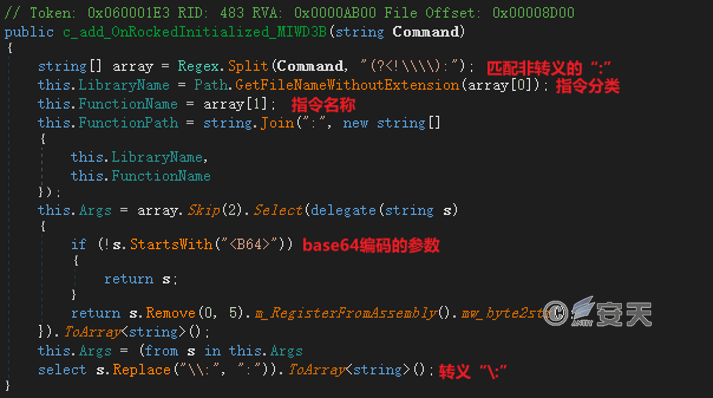 According to the configuration information, connecthttp://45.9.148.203:4545/gate/<用户ID>/getCommands to obtain the remote control instruction at an interval, and the instruction is composed of multiple strings separated by “:” The first two paragraphs are instruction classification and instruction name, and the remaining part is the parameter list, if the parameter contains “:” Use “\:” Escape, if the beginning of the parameter is “< B64 >,” the parameter content is encoded in base64. The relevant codes for analyzing remote control instructions are as follows.