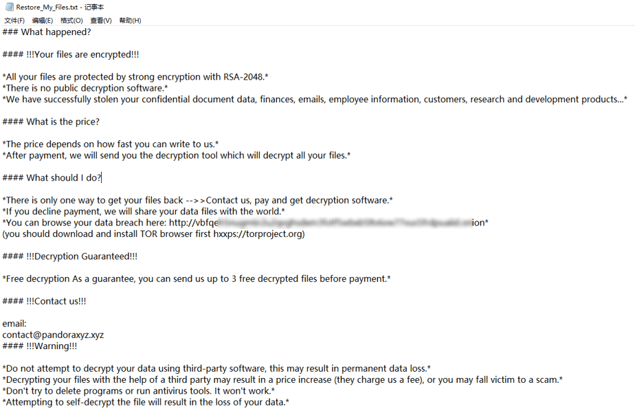 A ransom note is generated when the encrypted file is finished, which contains a ransom note, contact information and the Tor website address.