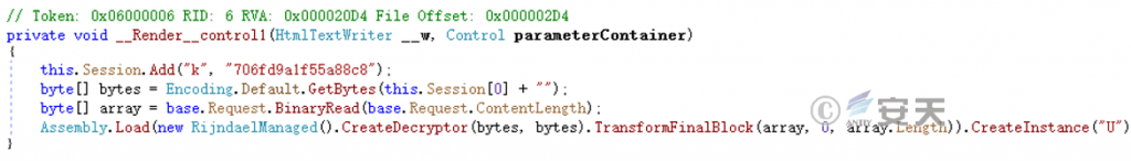 The handler decrypts the payload using the AES algorithm and loads it, creates an instance of a class with the class name “U,” and executes the code in the request.