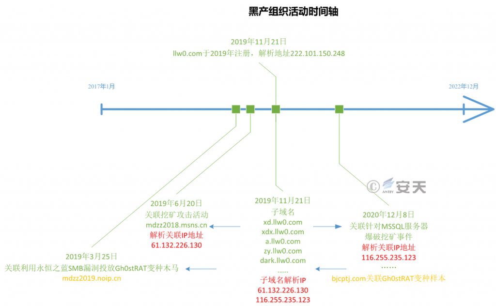 According to the attack domain name lllw0.com [3] disclosed in the tracking intrusion log of Friends, Antiy analyzed the IoC of the event based on the TID threat intelligence comprehensive analysis platform. Discover the organization’s historical activities as well as more IoCs used for this event. Combined with the attacking method, attacking technique, tool information and attacking purpose of the “Magic Flute” organization, it is inferred that the organization is a black organization from China. With the earliest C2 analysis currently linked, the organisation is likely to start its activities as early as 2017. In its historical activities, the group mainly used mining attacks for the purpose of seeking money, mainly used Gh0st remote control to control the target, and was good at using all kinds of hacking tools. In this attack activity, “magic flute” organization may know from somewhere the flaw of certain home-made financial software, use the past experience and resources to continue to launch the attack to put blackmail program to seek money.