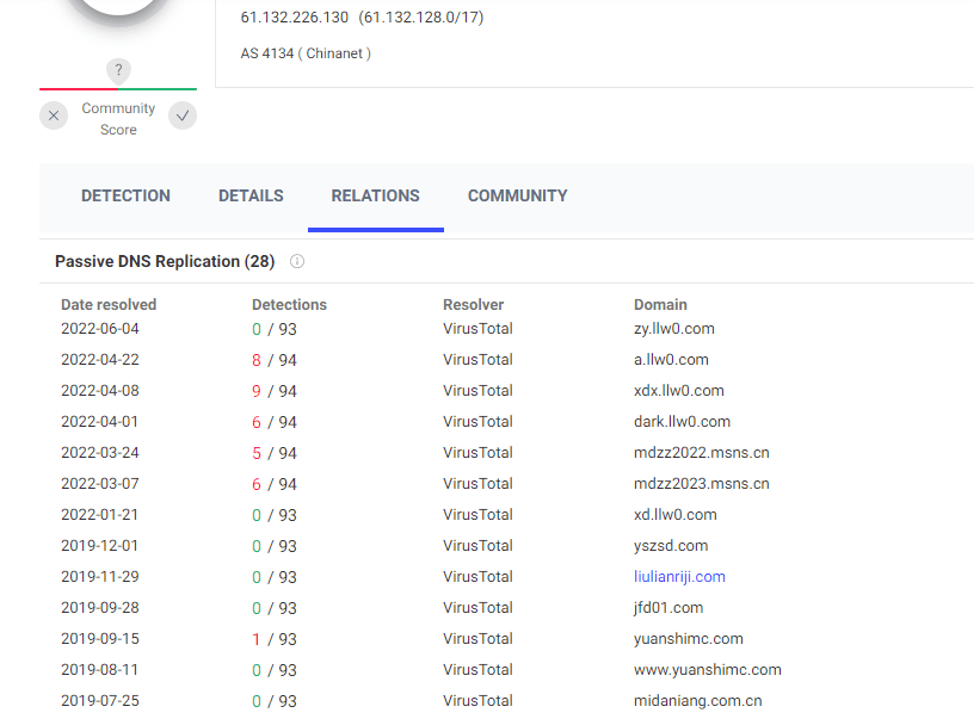 Multiple llw0 .com subdomain histories have resolved to 61.132.226.130, and the server is owned by the attacker. The mdzz2022.msns .cn and mdzz2023.msns .cn have also been resolved to this IP, and several Gh0st remote control Trojans communicate with two domain names, so the two domain names of mdzz are also likely to belong to this organization.