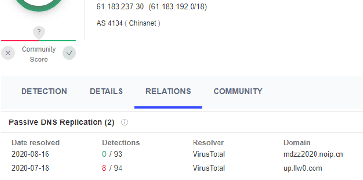 Up.llw0.com subdomain was resolved to 61.183.237.30 in July 2020, and mdzz2020.noip.cn was resolved to 61.183.237.30 in August of the same year. Mdz2020.noip.cn related files are also mostly remote control Trojans, combined with the last section of MDZ.2020.noip.cn domain name features, MDZ.2020.noip.cn is likely to be the same attack organization assets.