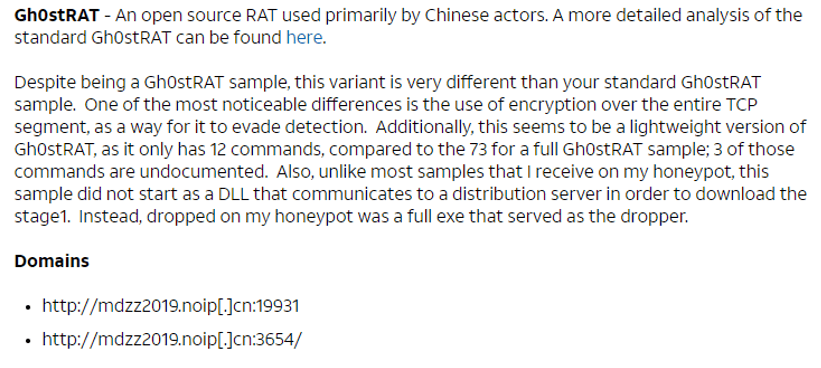 Also analyzing the domain name of mdzz2020.noip.cn, we found that its brother domain name mdzz2019.noip.cn, which was disclosed by foreign security agencies in the 2019 analysis report, is the C2 address of the remote control of the variant Gh0st.