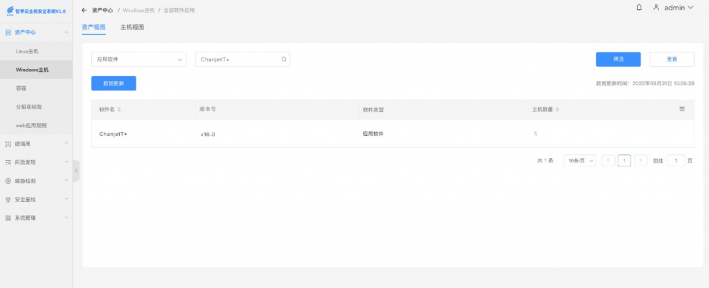 Antiy IEP cloud host security system web interface – Asset Center – Windows host – All software applications – Asset View, where you can view information related to Chanjet + software.