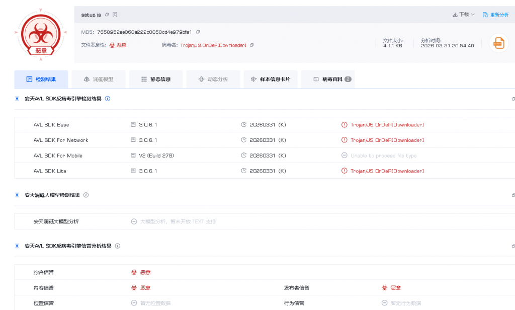 In response to the Axios supply chain malware attack, Antiy Antivirus Engine has added four new malicious code names and corresponding detection rules. The names strictly adhere to the structured naming convention of “category/environment prefix.family name [key behavior]”, namely Trojan/JS.OrDeR[Downloader], Trojan/Python.OrDeR[Backdoor], Trojan/MacOS.OrDeR[Backdoor], and Trojan/PowerShell.OrDeR[Backdoor]. These rules can effectively detect all threat files involved in this incident. Antiy Engine ecosystem partners are advised to promptly update their Antiy Engine virus database to version 2026033119 or later.