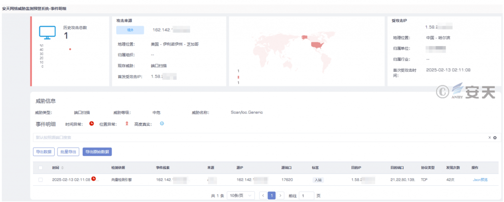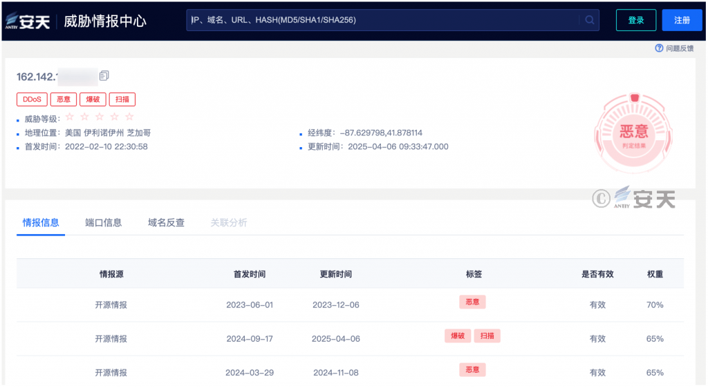 The Antiy Threat Intelligence Center shows that the attack IP belongs to the United States, with “malicious,” “demolition,” “scanning” and other labels.