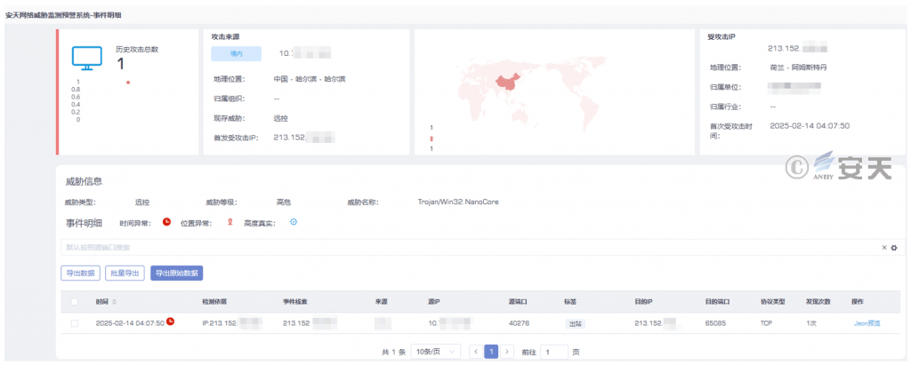 At 4: 00 on February 14, 2025, Antiy monitored and blocked a remote control attack in the Netherlands where the attack source IP address was located. The Antiy Cybersecurity Guard Team tracing analysis found that this IP had spread the remote control Trojan family NanoCore. Nanocore is a well-known remote control Trojan that was originally developed as a legitimate remote management tool, but is widely used for malicious purposes. It has functions such as remote control, keylogger, screen monitoring, data theft and camera control, and is often spread through phishing emails or vulnerabilities. Infection can result in privacy breaches, data theft and devices being fully controlled.