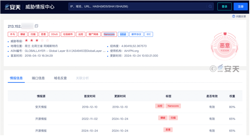 According to the Threat Intelligence Center, the attack IP belongs to the Netherlands, with “malicious,” “remote control,” “NanoCore” and other tags.
