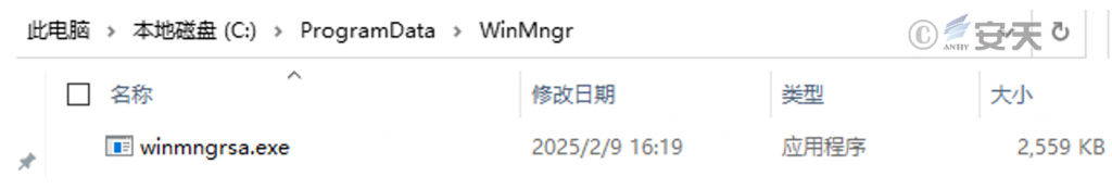 After running, the Trojan will copy itself to the directory C:\ProgramData\WinMngr\, name it winmngrsa.exe, and reside in the system with the process name winmngrsa. exe.