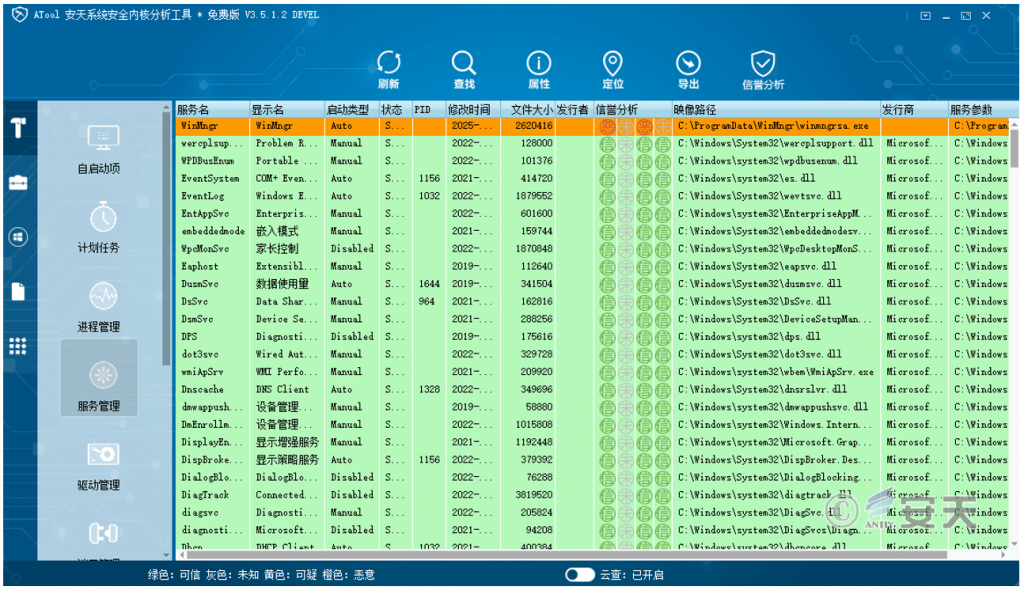 Delete the original “WinMngr” service in the system, re-create the service with the same name and set it as self-startup, so as to facilitate the victim machine to execute again after restart. The following figure shows the service created by using ATool’s cloud search function to find the virus, and orange means malicious.
