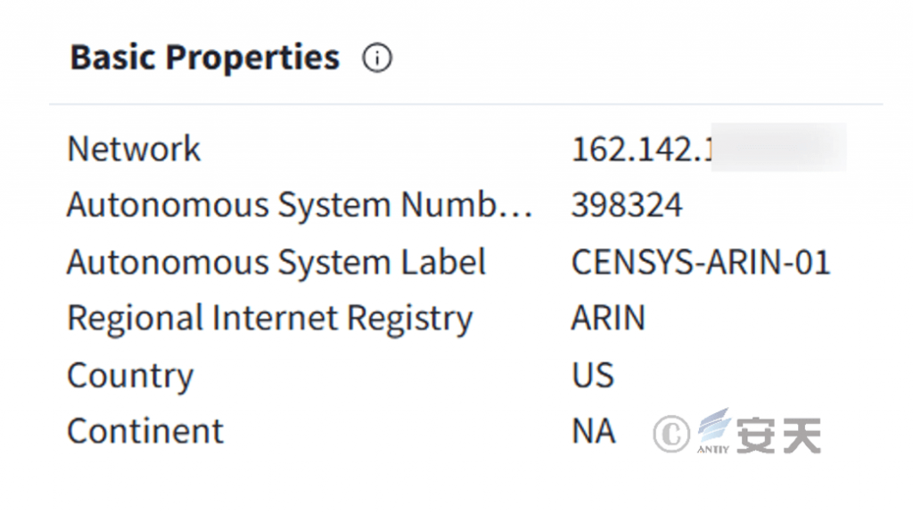 An ASN query is made to the attack IP and it is found that it belongs to AS 398324 (CENSYS-ARIN-01), and the CENSYS-ARIN-01 network segment is owned by US company Censys, Inc.