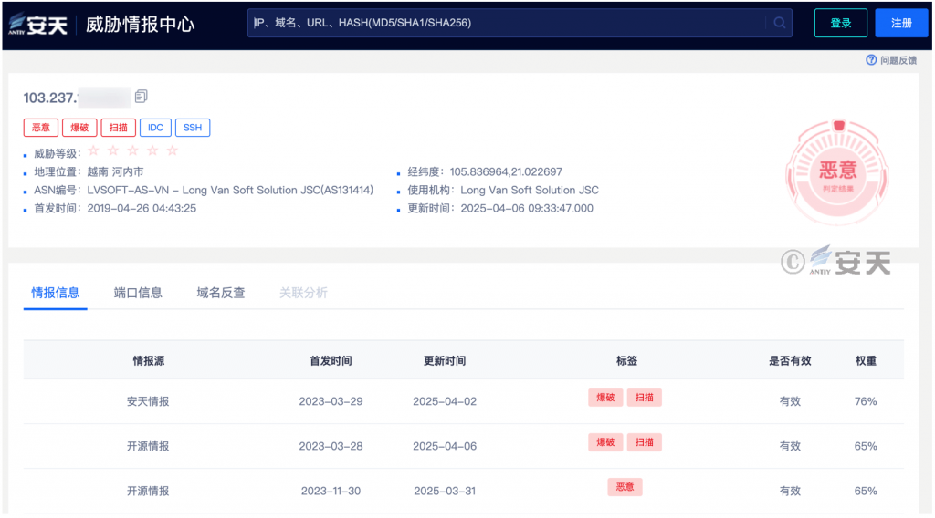Antiy Threat Intelligence Center shows that the attack IP belongs to Vietnam, with “malicious,” “demolition,” “scanning” and other labels.