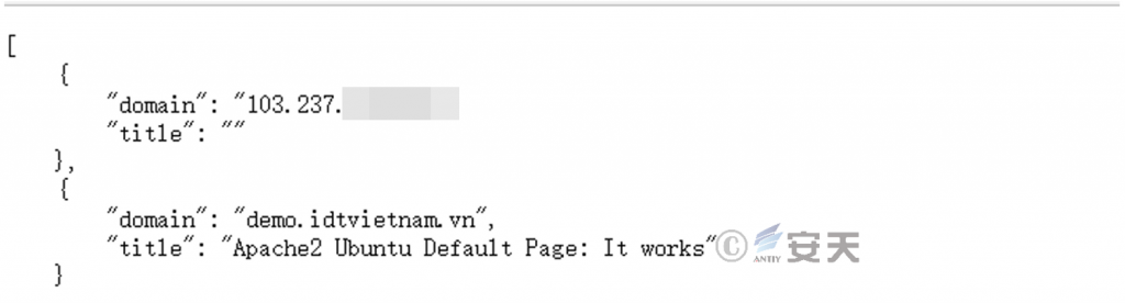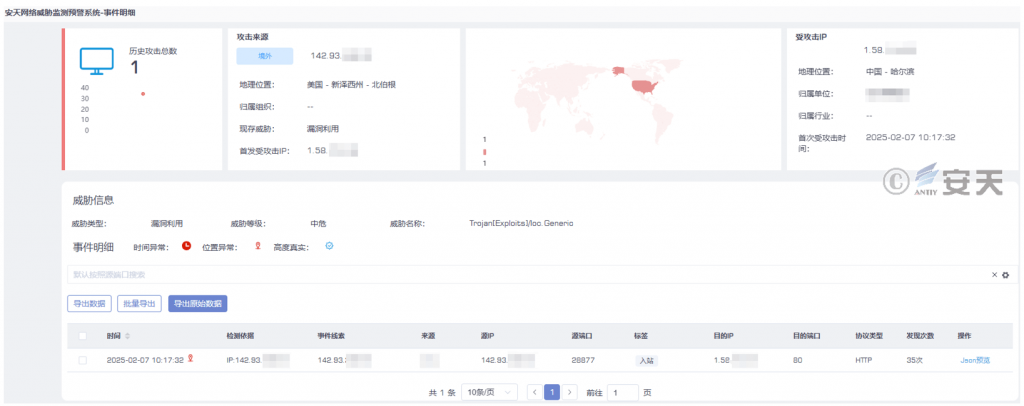 At 10: 00 on February 7, 2025, Antiy monitored and blocked a vulnerability exploitation attack in which the source IP address of the attack was located in the United States, and the attacker attempted to exploit the vulnerability to gain system control authority. The Antiy Cybersecurity Guard Team quickly responded and completed the study and judgment of the attack, confirmed that the attack did not cause actual harm, and immediately started to trace the source. Through such means as threat intelligence inquiry, domain name counter-search, historical asset mapping and Internet search, it is found that the IP is related to the domain name (binaryedge [.] ninja) of BinaryEdge, a Swiss network security company.