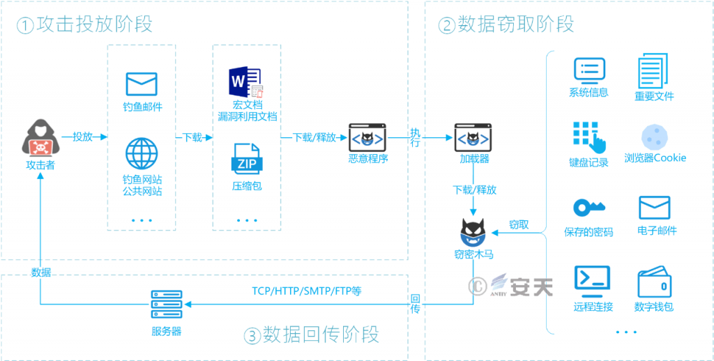 The attacker uses the topic that the user is interested in as the decoy, through the phishing mail, the phishing website, the public website and so on, launches the attack payload, induces the user to download. Most of the attack load is in the form of macro documents, Office vulnerabilities or malicious program compression packages. when the victim opens the documents and enables macro, when the Office software has corresponding vulnerabilities or inadvertently unzips and runs, the malicious program will execute. In general, a malicious program consist of an outer loader and an inn load of a secret Trojan, and that outer loader downloads and decrypts the load of the secret Trojan to provide it with the capability of defense, evasion and persistence. Finally, the internal secret Trojan horse steals the victim’s password credentials, privacy information, important documents, digital assets and other data back to the attacker.